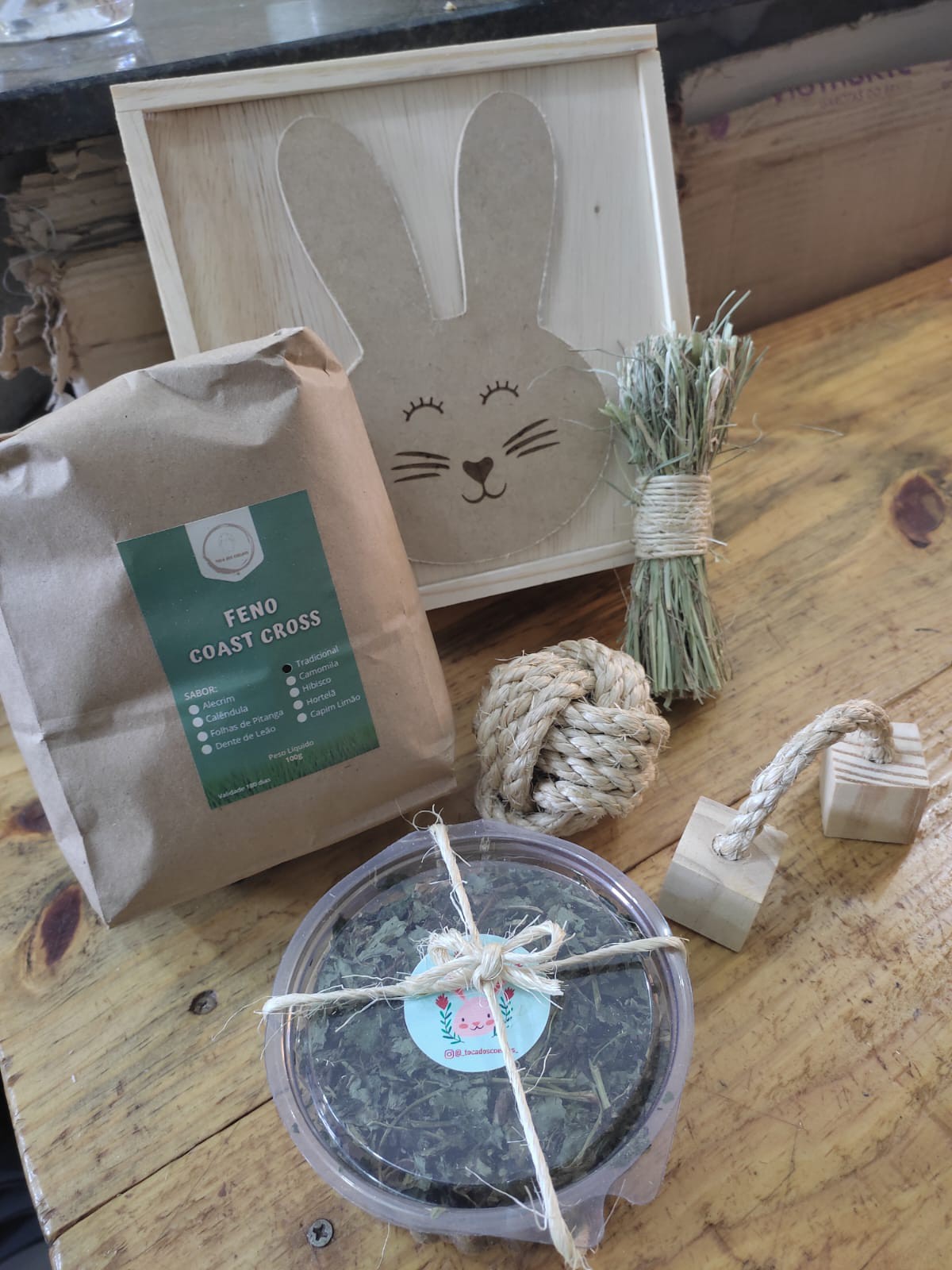 Uma linda caixa de madeira modelo estojo, abre e fecha tampa, que contém vários brinquedos para seu orelhudo.